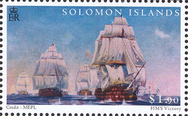 Марка издана в блоке. На поле блока — портрет Нельсона (Лемюэль Фрэнсис Аббот, 1798—1799, Гринвич, Национальный морской музей).