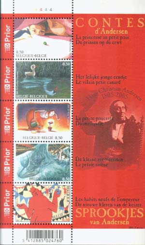 Марки изданы в блоке. На поле блока — портрет Андерсена.