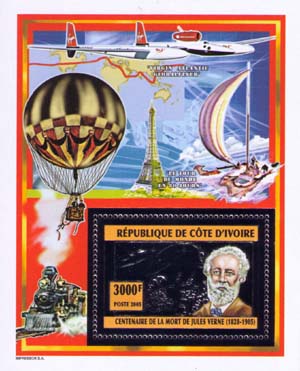 Марка также издана в двух блоках. На поле первого блока — иллюстрация к роману Жюля Верна «Вокруг света в восемьдесят дней» и самолет авиакомпании «Virgin».