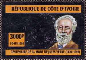 Портрет Жюля Верна, летательный аппарат над тропическими джунглями.